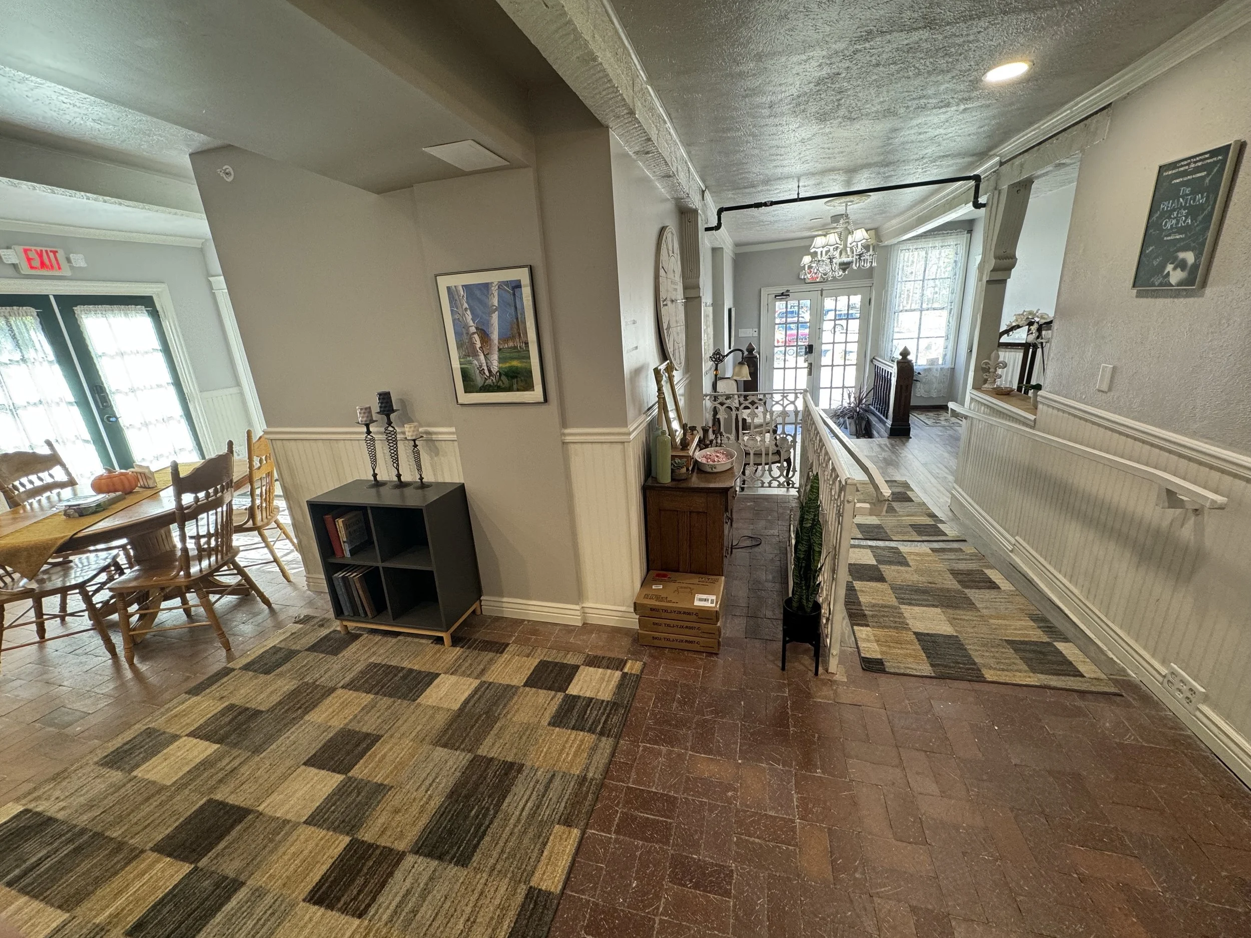 In 2023, Darla purchased the hotel and began the process of remodeling it into a new and improved version of the St James Hotel. First, I had to get architectural plans drawn up to present to the city planning department and the historic committee. Once approved, we began demo and construction. You can see in the photos what the main level looked like before and after. Renovating an 1875 frame building was quite a challenge, but we left much of what was there and just added more framing, bedrooms, and bathrooms to the existing structure. We lett the exterior exactly as is due to historic restraints but also to keep the 1875 history alive. From the outside it doesn’t look like much, but inside it is old world charm meets modern amenities.